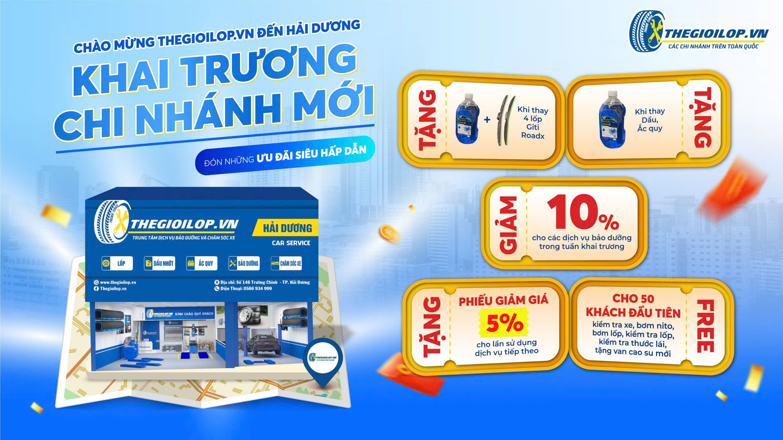 Thegioilop.vn rất vui mừng thông báo về việc khai trương cửa hàng chi nhánh mới tại Hải Dương! Sau một thời gian dài phục vụ khách hàng tại nhiều tỉnh thành, giờ đây Thegioilop.vn chính thức có mặt tại Hải Dương, mang đến dịch vụ chăm sóc xe, lốp xe và phụ kiện ô tô chất lượng với những ưu đãi đặc biệt dành riêng cho cư dân nơi đây.
