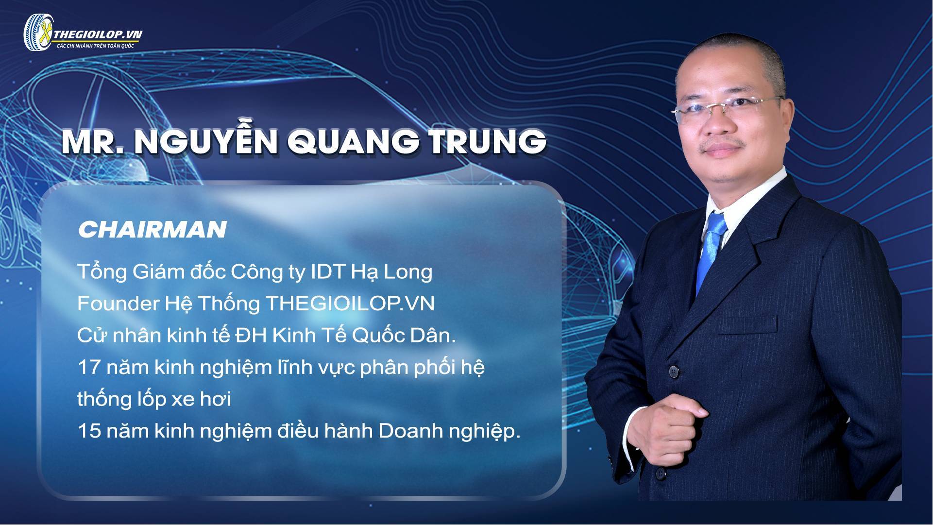 Ông Nguyễn Quang Trung là người đặt nền móng cho hệ thống Thegioilop.vn, với tầm nhìn phát triển bền vững và chiến lược mở rộng chi nhánh trên toàn quốc. Nhờ kinh nghiệm dày dạn trong ngành, ông đã xây dựng Thegioilop.vn trở thành thương hiệu uy tín hàng đầu, mang đến dịch vụ bảo dưỡng nhanh chuẩn mực cho khách hàng Việt.