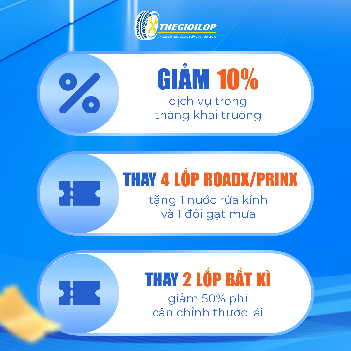 - GIẢM 50% phí cân chỉnh thước lái khi thay từ 2 lốp